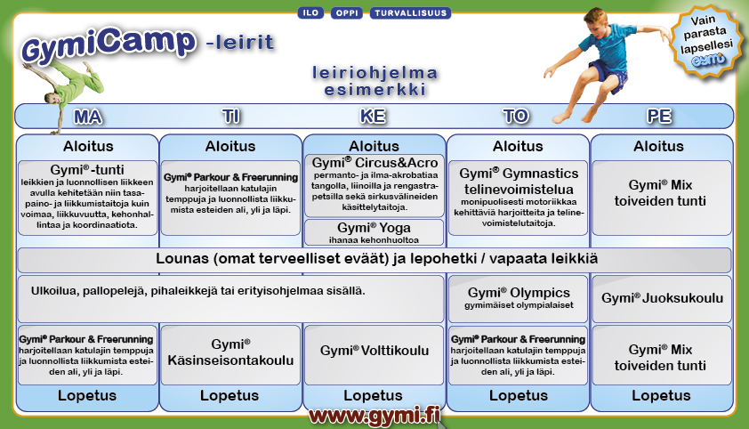 Gymi Camp -kokopäiväleirillä on ohjattua ohjelmaa n. klo 9.30-15 päivittäin. Gymille voi kuitenkin yleensä saapua jo aiemmin ja viipyä pidempään. Varmista aikataulut omasta toimipisteestäsi! Työssä käyville vanhemmille Gymin leirit ovat siis myös luotettava lastenhoitopaikka.